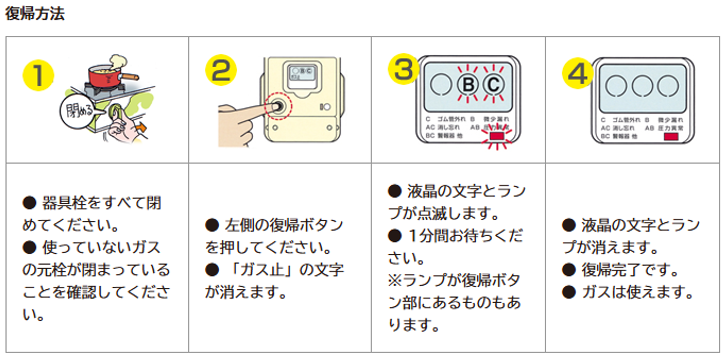 ガスを使用中に強い地震(震度5相当以上)が起きたときは、ガスメーターに搭載されている安全装置により自動的にガスが遮断しますので、以下の方法により復帰操作を行ってください。